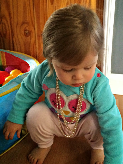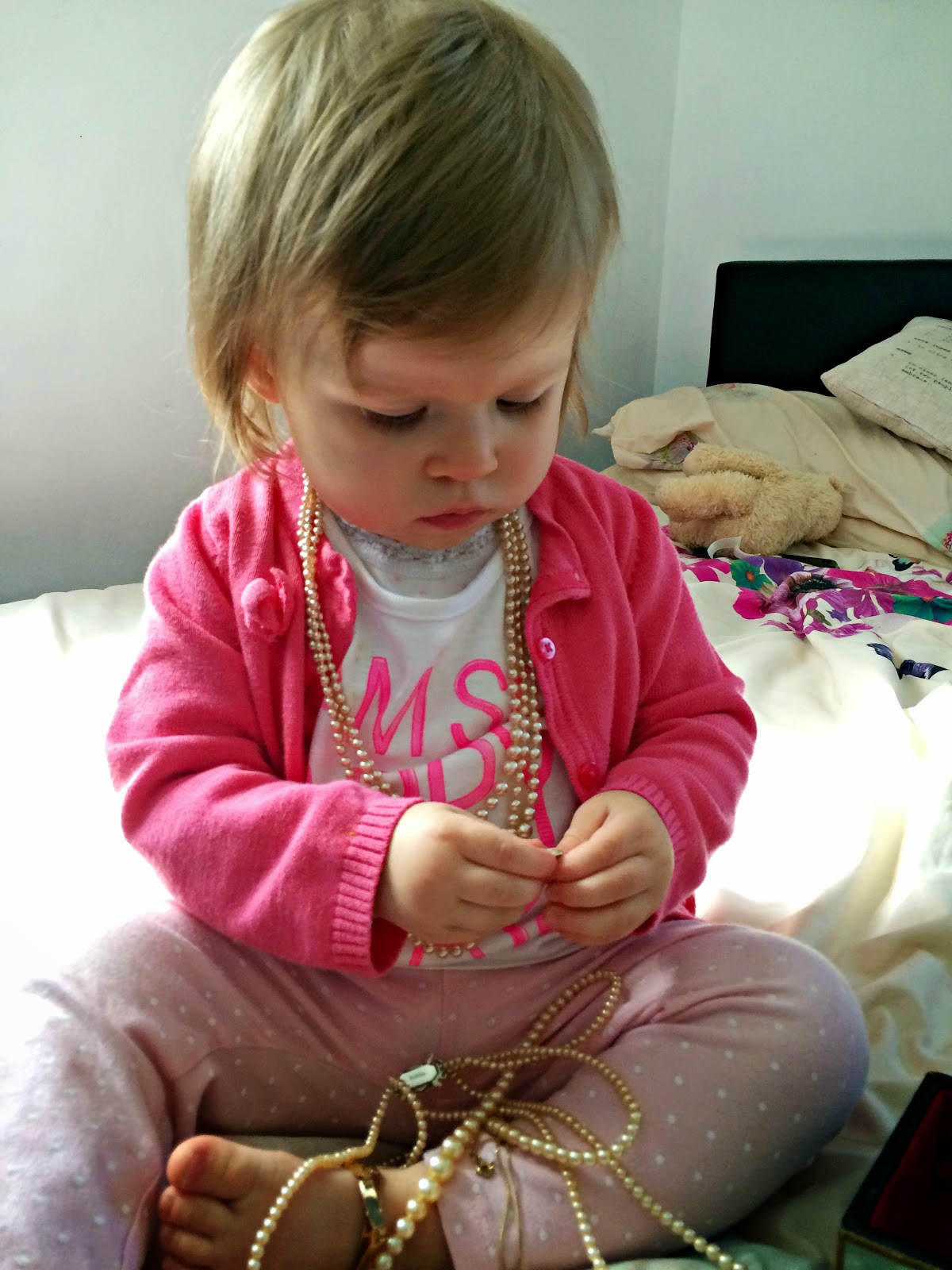 On Wednesday I turnt my back for two seconds and Indie had pulled out my jewellery box and was sat on my bed opening the drawers. I let her play and explore and pull out the drawers. She pulled out a set of pearls that were her Great Grandmothers which were passed onto me. She immediately put them on herself and carried on exploring the jewellery box.