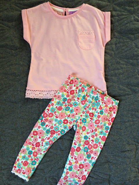 This outfit is one of the ones that cheers me up a little on  a gloomy day. Bright and cheerful! The floral leggings are from Mothercare and were part of a two pack. I love her little pink top, especially the little lace trim detail and the cute little fold up sleeves. It's from F&F at Tesco.
