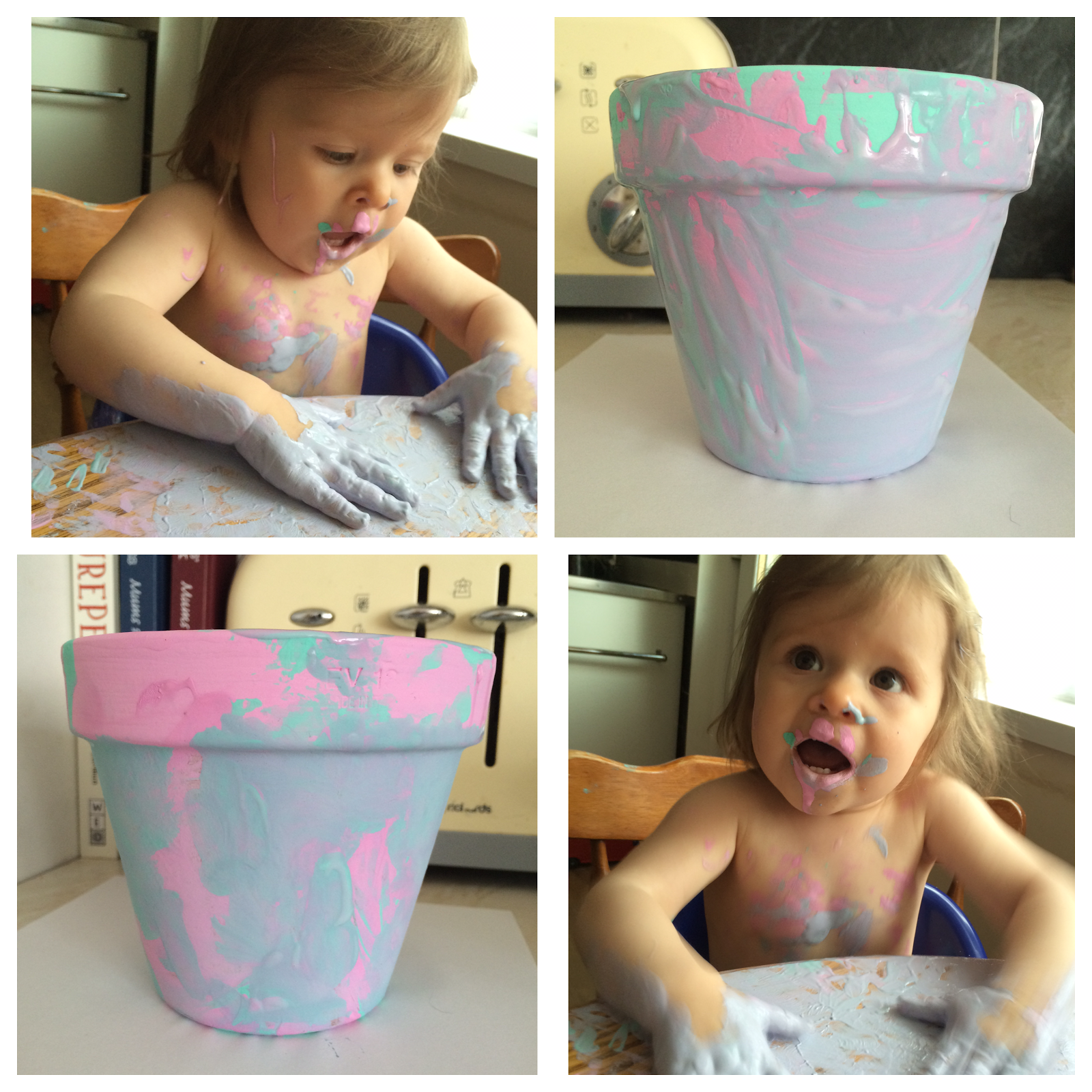 I'm not sure what went through my mind when I decided to let a toddler play with a breakable terracotta pot, but I did. We got her paints out and a little brush and Indie loved it (although my heart was in my mouth expecting her knock it off the table). It didn't take long for the brush to be thrown on the floor and Indie's hands to take over the painting. She made such a mess and we had lots of fun.