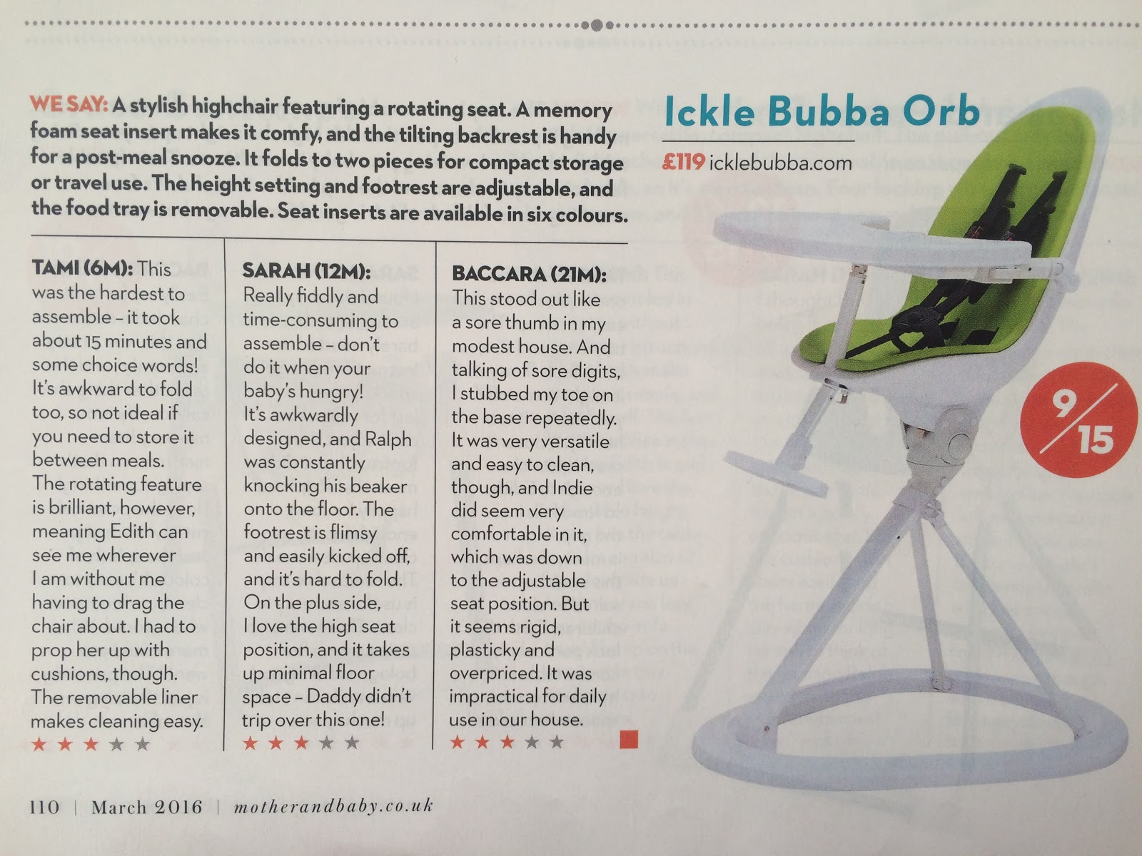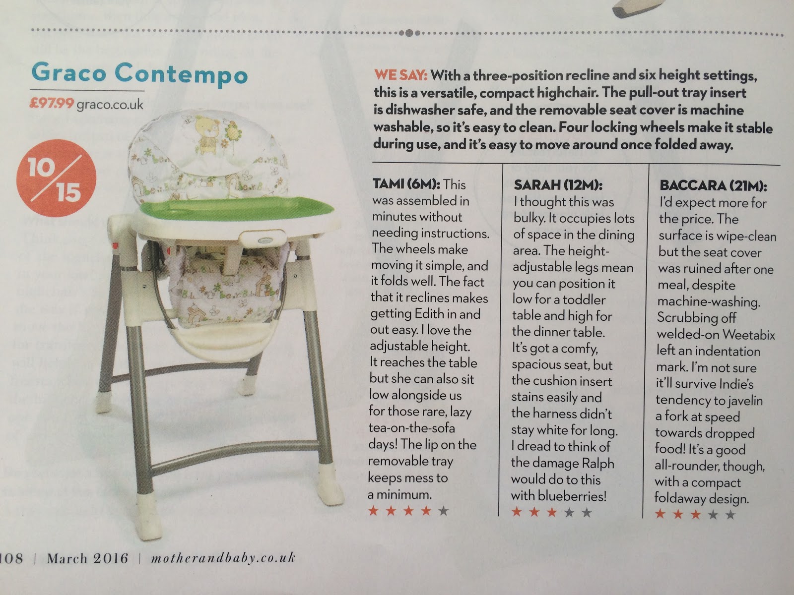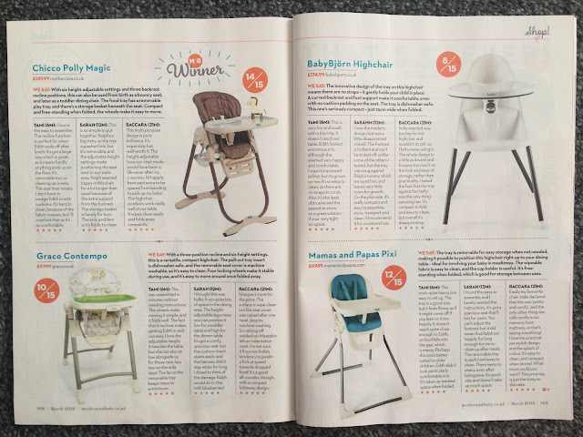 If you follow me on my other social media channels then you've probably seen me going on about the fact that I was chosen to review some highchairs a few months ago for Mother & Baby magazine. I tested and reviewed six highchairs and then wrote mini reviews which were featured in a five page spread in the March Issue alongside 2 other 'reviewers'. It's something I'm pretty proud of so I thought I'd share it with you.