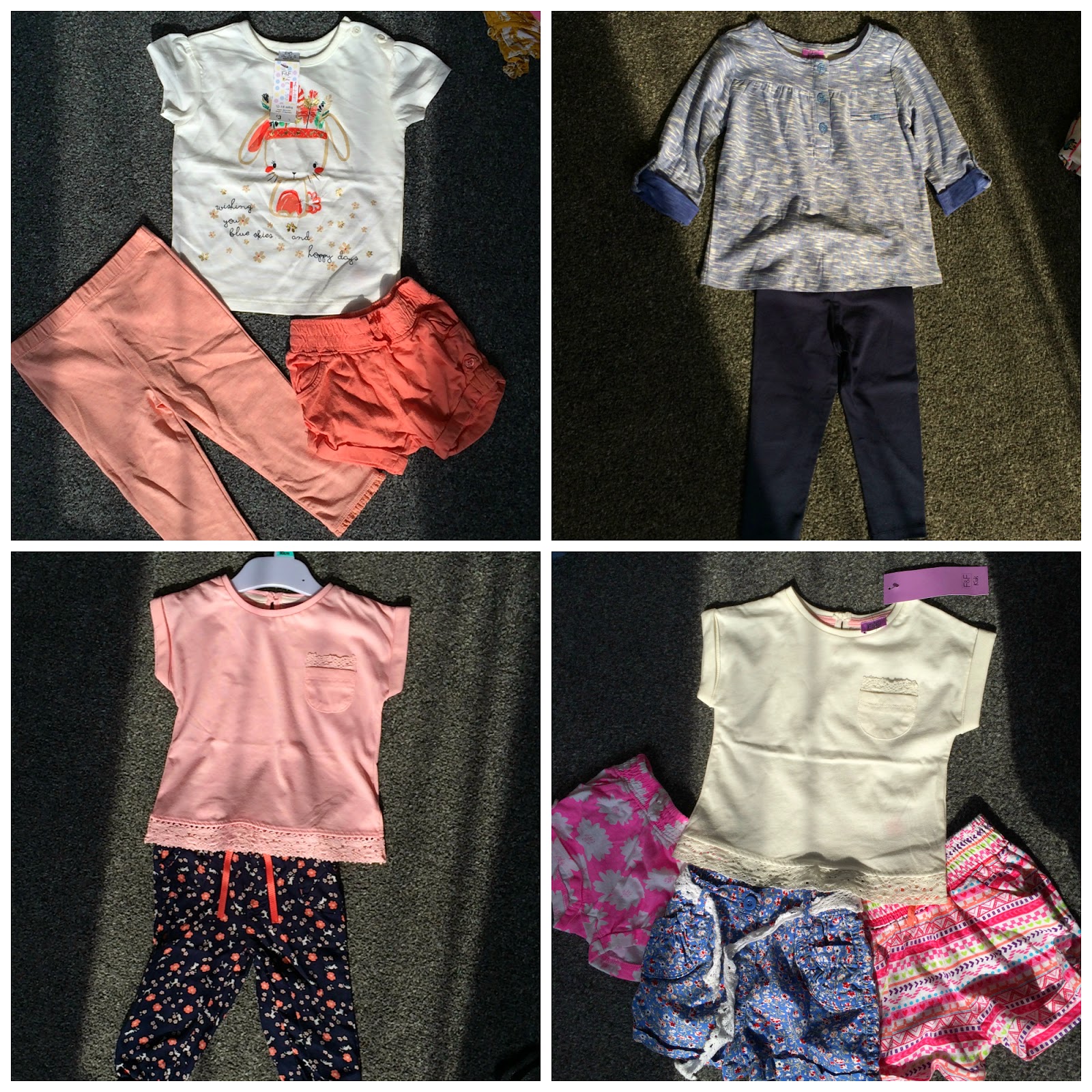 1) Top and leggings F&F, Shorts from Primark 2) Whole outfit from Primark 3) Top from F&F, Leggings from Mothercare 4) Top from F&F, Shorts all from Primark |