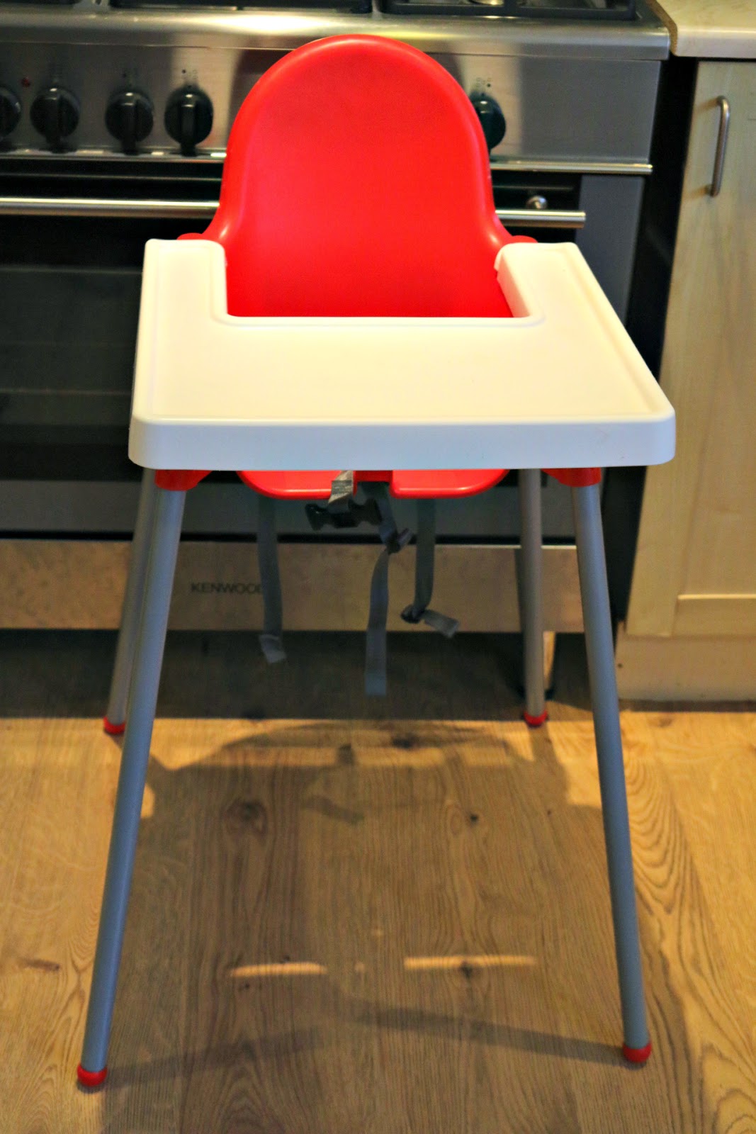 During the baby stage it's fairly easy to keep a child occupied with food. Once they become a toddler they tend to get a little more mischievous and try to climb out so I highly recommend a highchair with straps, preferably one that is easy to wipe clean. We use the Ikea Antilop and cannot recommend it enough.